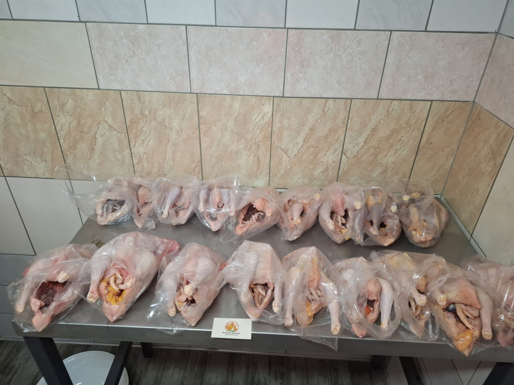 Házilag tartott kapirgálós tyúk, konyhakészen.  Szerda este történik a vágás. Súlya: 1,3-1,4kg között. A húsleves adott, már csak a fazék kell hozzá.
