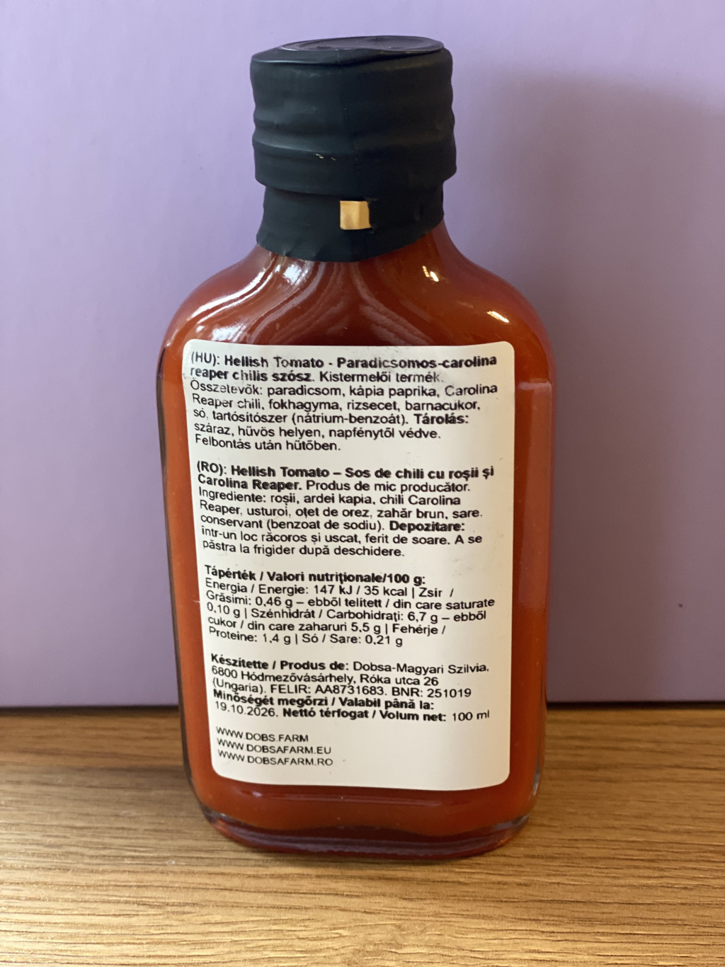 A Hellish Tomato – paradicsomos Carolina Reaper chilis szósz egy igazi tüzes különlegesség, amelyet a világ második legerősebb chilije tesz felejthetetlenné. Van egy hasonló, jóval kevésbé csípős szószunk, a Fiery Tomato, amely habanero chilivel készült. Ez a szósz annak egy sokkal csípősebb változata, nem véletlenül kapta a Hellish Tomato nevet, hiszen sokkal több chilit használtunk, és a Carolina Reaperre esett a választásunk. Kellemes, paradicsomos, enyhén fokhagymás alapíz, ami mellé jön a Carolina Reaper csípőssége.